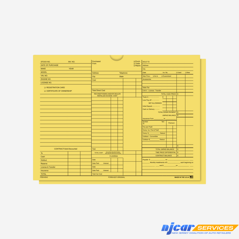 Provides all information on sale of New or Used vehicle including reconditioning of used vehicle, detail of cost, and may serve as vehicle inventory record. Available in Buff only.