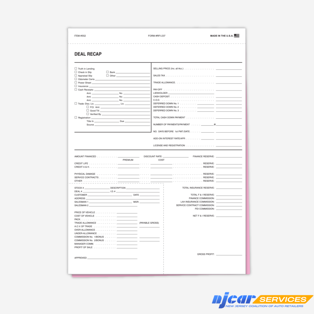 This recap form summarizes every component of the deal, from vehicle info to financing, trade-in, and documentation checklist. It’s a great way to catch missing paperwork before delivery.